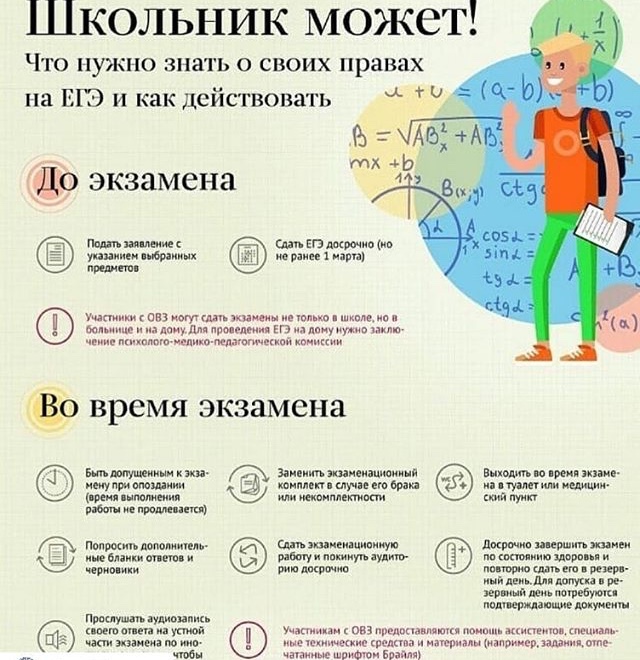 Какие возможности есть у участников ЕГЭ? Как учитываются особенности школьников с ОВЗ? Что делать, если не согласны с количеством выставленных баллов или порядком проведения экзамена? Ответы на эти вопросы - в инфографике "Социального навигатора" МИА "Россия сегодня", подготовленной совместно с Федеральной службой по надзору в сфере образования и науки.